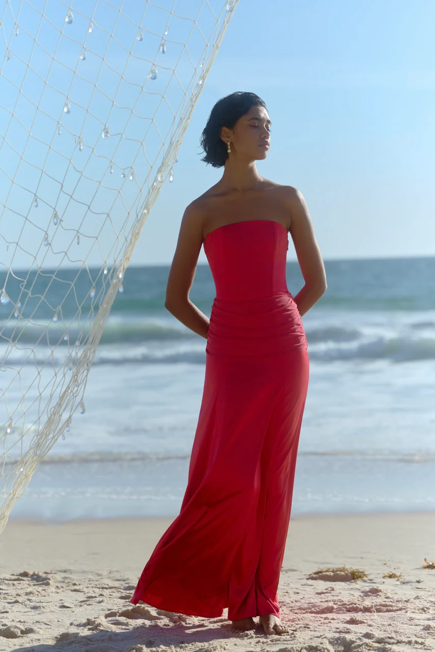 El Vestido Celine es una declaración atemporal de elegancia. Confeccionado en satén elástico de lujo, esta silueta strapless presenta una falda en línea A con amplitud en el bajo gracias a godets fluidos que aportan movimiento y gracia en cada paso. Un panel de malla elástica translúcida, delicadamente fruncido sobre el abdomen tanto al frente como en la espalda, añade textura y un toque contemporáneo a su forma clásica. Romántico y sofisticado a la vez.